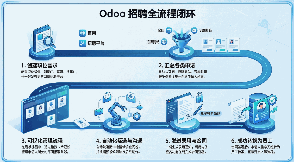 在了解了这些强大的核心工具后,接下来我们将把它们串联起来,完整展示 Odoo 如何实现一个从职位发布到录用决策的端到端集成化招聘流程。