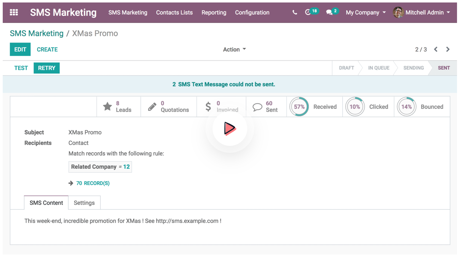 编写各类短信,以备之后发送。Odoo为您处理发送,您无需连接,即可将活动传播到全世界!
